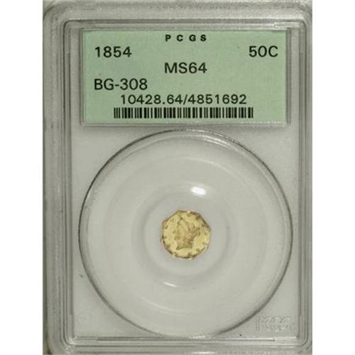 <B>1854 50C Liberty Octagonal 50 Cents, BG-308, R.4, MS64 PCGS.</B></I> A straw-gold representative with glimpses of milk-gray toning above the hair bun and near the coronet tip. Evenly struck, attractive, and housed in a green label holder. Population: 5 in 64, 0 finer (4/07).<BR><I>From The Vanek Collection.</B></I><BR><BR><b>Shipping:</b> Coins & Currency (<a target="_blank" href="http://www.heritageauctions.com/common/shipping.php">view shipping information</a>)