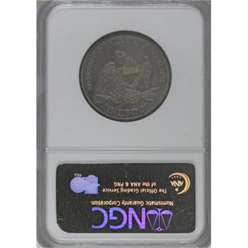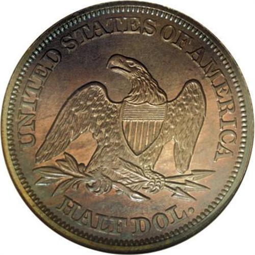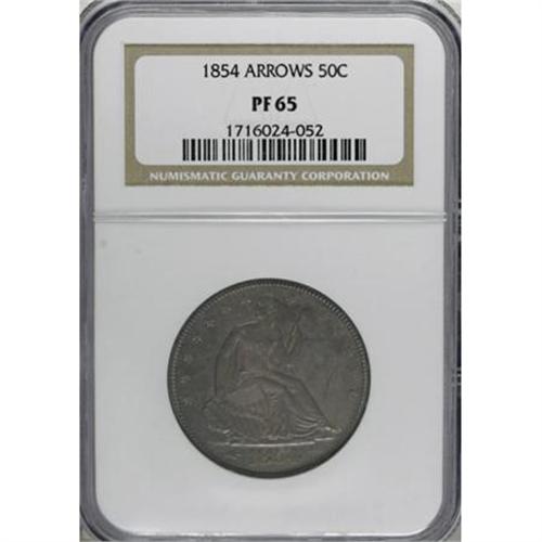<B>1854 50C PR65 NGC.</B></I> The 1854 Arrows half is a significant 19th century rarity. So few have been seen by any one person, however, that in the past its rarity has been overstated. Breen (1977) said just three pieces were known. Wiley-Bugert estimated that "less than 6 known." The advent of third-part grading has made it possible for two entities (PCGS and NGC) to verify rare proofs and certify them. So, over the course of 20 years, it is probable that most of the proofs of this issue have been seen. Both of the major services combined have certified 26 pieces in all grades, and we estimate that translates into around 20 separate coins.<BR> When he cataloged the Kaufman PR66 1854 half, Mark Borckardt noted: "While separated from Liberty's base and the border, the date and arrows are slightly above center in the exergue. The shield point is over the outer left curve of the 8, and 54 are extremely close but do not touch. Similar to Breen's description, but the stars do not have any extra outlines. No unusual reverse characteristics are noted, other than faint clash marks visible just inside the right shield border. Seated coins of various dates and denominations often show similar clash marks." These diagnostics are present on this piece also.<BR> The fields show the depth of reflectivity one would expect from a proof striking. The surfaces on each side display deep blue, purple, and rose toning. There are no noticeable flaws, but the peripheral obverse stars lack complete striking definition.<BR><BR><B>Coin Engraver:</B> Christian Gobrecht<BR><BR><b>Shipping:</b> Coins & Currency (<a target="_blank" href="http://www.heritageauctions.com/common/shipping.php">view shipping information</a>)
