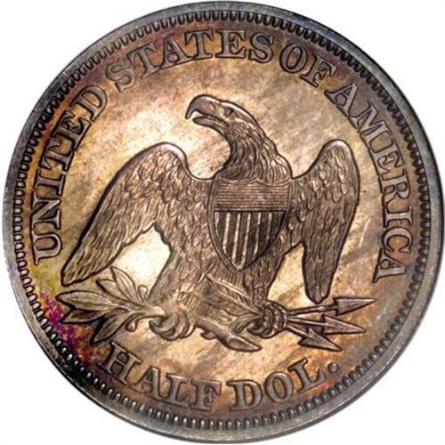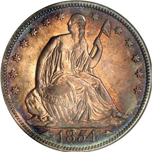 <B>1854 50C Half Dollar PR66 NGC.</B></I> Ex: P. Kaufman. Perhaps the finest proof known, the Kaufman Premium Gem is tied for the grade with one other piece in the NGC census. No finer examples have been certified. The proof 1854 half dollar appears to be the rarest silver denomination of the date. <BR> When Breen compiled his <I>Proof Encyclopedia</B></I>, just three specimens were recorded, with the comment that the half dollar is "about as rare as the quarter." Since he earlier said that the 1854 proof quarter is "about as rare as the dime," all three denominations were equally rare in his opinion. By 1988 he revised his opinion to state "probably fewer than 20 proofs survive" in his <I>Complete Encyclopedia</B></I>. Others suggest that about 10 to 12 survive, a seemingly realistic figure. The proof half dollar is slightly rarer than the dime and quarter, but the often reported figure of just five or six known is certainly too low.<BR> While separated from Liberty's base and the border, the date and arrows are slightly above center in the exergue. The shield point is over the outer left curve of the 8, and 54 are extremely close but do not touch. Similar to Breen's description, but the stars do not have any extra outlines. No unusual reverse characteristics are noted, other than faint clash marks visible just inside the right shield border. Seated coins of various dates and denominations often show similar clash marks.<BR> A wonderful Premium Gem proof with lovely light gold toning at the centers that gradually changes to russet, lilac, and blue near the borders. A slightly uneven strike is indicated by weakness at the upper obverse and lower reverse. The top of Liberty's head, stars 6 through 10, the eagle's left facing left, and the left claw all show weak definition. These strike characteristics are also seen on the Pittman and Starr proofs, and likely on all others. Census: 2 in 66, 0 finer (6/07).<BR><I>Ex: J.M. Clapp; John H. Clapp; Clapp Estate via Stack's (1942); Louis E. Eliasberg, Sr. (Bowers and Merena, 4/1997), lot 1958.<BR>From The Phil Kaufman Collection of Early Proof Sets, Part One.</B></I> (#6407)<BR><BR><BR><B>Coin Engraver:</B> Christian Gobrecht<BR><BR><b>Shipping:</b> Coins & Currency (<a target="_blank" href="http://www.heritageauctions.com/common/shipping.php">view shipping information</a>\)