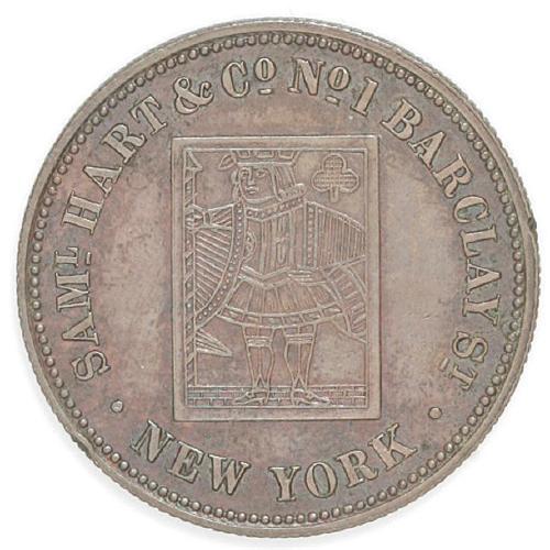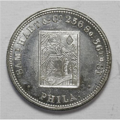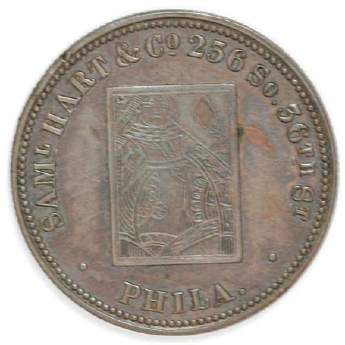 <B>(1854-57) Saml. Hart & Co. Group Lot.</B></I> Includes two tokens issued as advertising cards. This concern was a manufacturer of playing cards. Both pieces are listed on page 385 of the Rulau standard reference. Listed as Pa 197a and Pa 197b (white metal, Uncirculated) in the Rulau fourth edition. Both come with their original sleeves from the 1974 Presidential Coin and Antique Co. Inc. auction, held in conjunction with the National Token, Medal & Exonumia Jamboree.