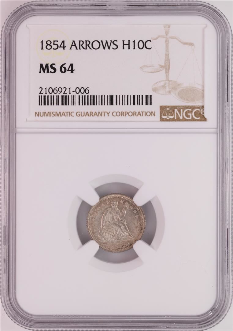 One 1854 Arrows Seated Liberty Half Dime Coin NGC MS64. NGC Certified.