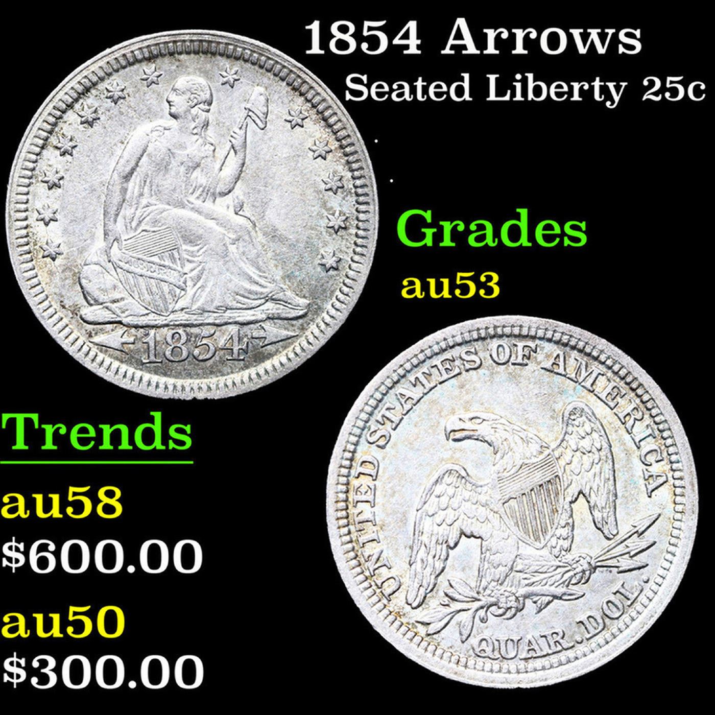 1854 Arrows Seated Liberty Quarter 25c Grades Select AU.