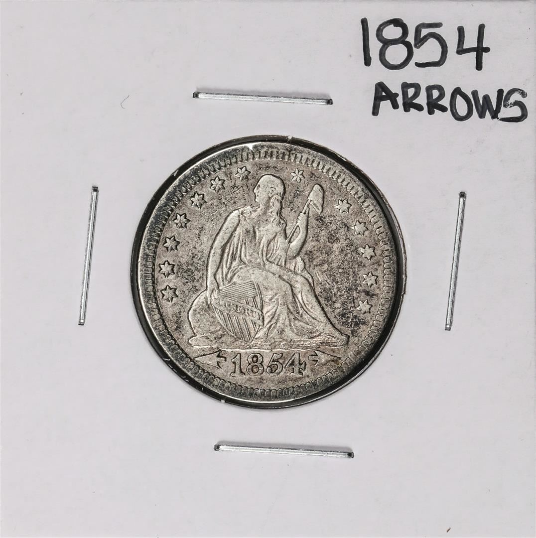 One 1854 Arrows Seated Liberty Quarter Coin.