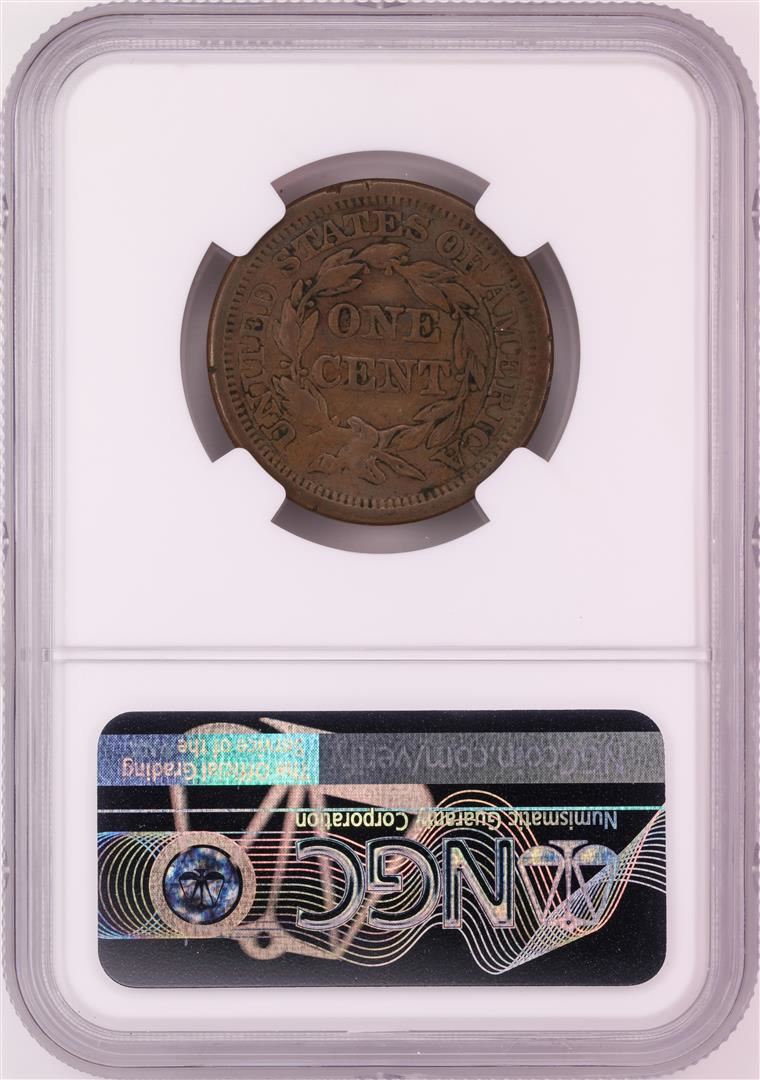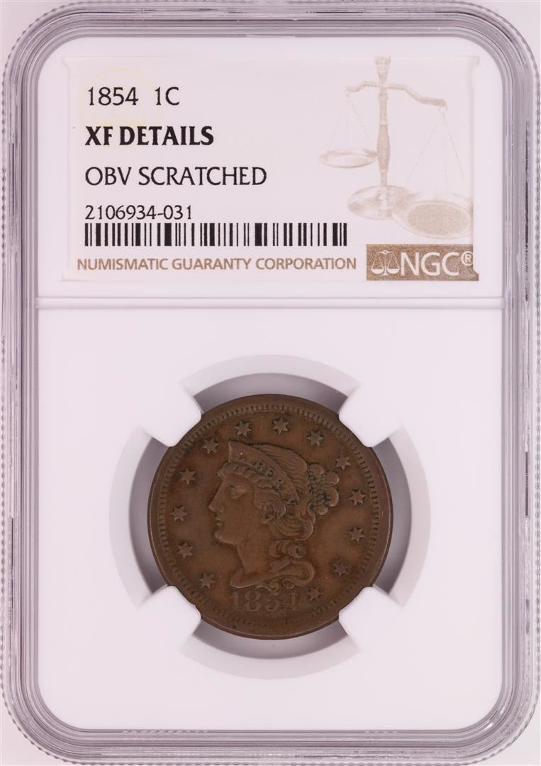 One 1854 Braided Hair Large Cent Coin NGC XF Details. NGC Certified.