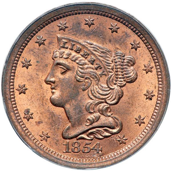 1854 C-1 R1+, CAC Certified. PCGS graded MS-64 Red & Brown. Lustrous frosty mint red fading to light steel brown on the highpoints with more than half the red remaining on both sides. Outstanding eye appeal for the grade. Would rate "gem" status except for a collection of microscopic planchet chips in the field before the bust tip and neck. These tiny marks were created by traces of debris on the die or planchet. The best identifying mark is a very small spot of reddish olive toning nestled between the upper left points of star 2. M-LDS, Manley state 2.0. The tiny dash left of the base of the 1 is weak but visible and a small but clear lump now shows on the upper part of the upright of the I in UNITED. Our grade is consistent with the slab grade.