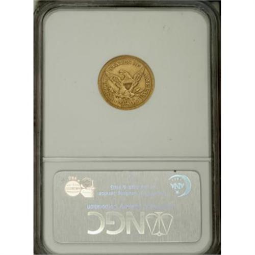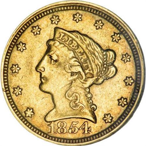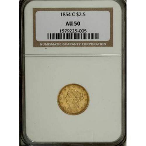 <B>1854-C $2 1/2 AU50 NGC.</B></I> Variety 15-I. No quarter eagles were struck at Charlotte in 1853, but the production of the denomination resumed in 1854. Only 7,295 pieces were struck, and survivors are very scarce. This yellow-gold representative is unabraded aside from minor marks on Liberty's forehead and jaw. The eagle's body is typically brought up, but the stars and dentils are sharp.<BR><BR><B>Coin Engraver:</B> Christian Gobrecht<BR><BR><b>Shipping:</b> Coins & Currency (<a target="_blank" href="http://www.heritageauctions.com/common/shipping.php">view shipping information</a>)