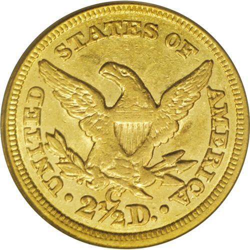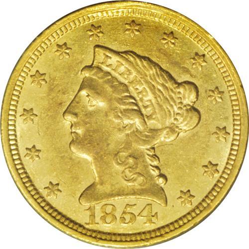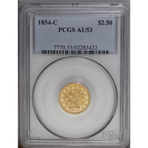 <B>1854-C $2 1/2 AU53 PCGS.</B></I> Variety 15-I. Remaining luster is substantial, and the clean surfaces are without blemishes. The centers display orange-gold toning. Some softness of strike in the centers, but the remainder of the devices are bold. A tiny mintage of 7,295 pieces ensures a paucity of survivors.<BR><I>From The Carolina Gold Collection, Part Two.</B></I>