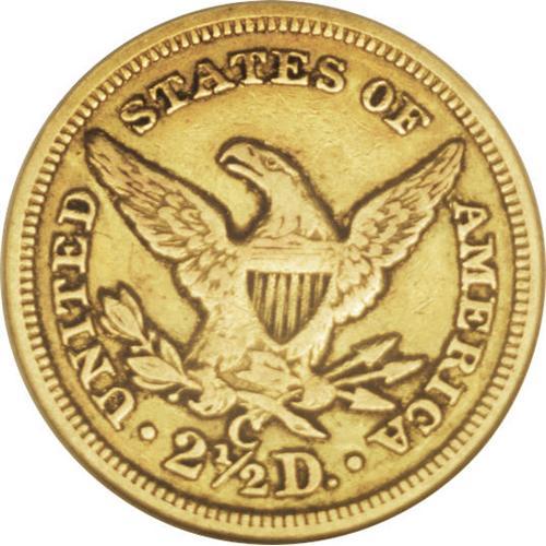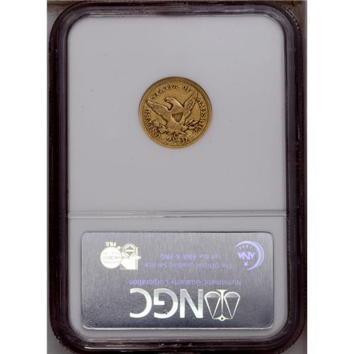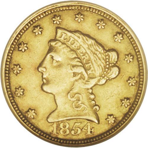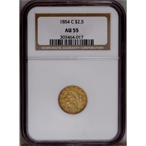 <B>1854-C $2 1/2 AU55 NGC.</B></I> Variety 15-I. A pleasing piece that has kept its original honey-gold skin. The reverse design is outlined by glimpses of deep russet toning. The stars, the eagle's wings, and the hair above the coronet are sharply struck. The eagle's body and the curls near Liberty's ear are typically delivered by the dies. No untoward marks are detected. Another difficult, low mintage issue. Just 7,295 pieces were struck. Population: 9 in 55, 8 finer (1/06).