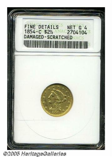 <B>1854-C<$2 1/2>--Damaged, Cleaned--ANACS. Fine Details, Net Good 4.</B></I> Variety 15-I. Several severe digs and scratches are noted at the lower portion of the obverse, and the surfaces have been polished. With a mintage of 7,295 coins, this is a challenging date