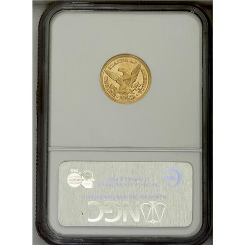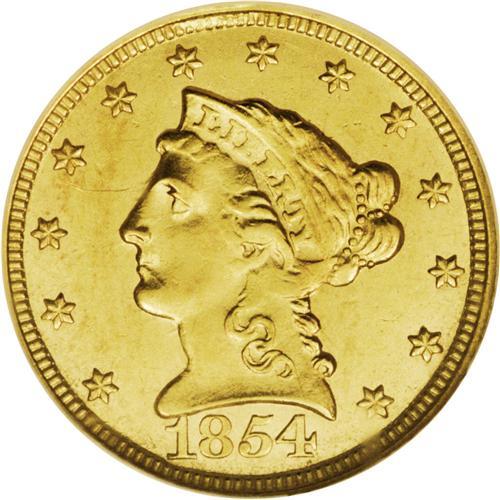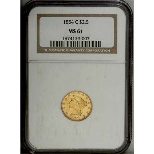 <B>1854-C $2 1/2 MS61 NGC.</B></I> Variety 15-I. This date is considered scarce and the present piece survives from a mintage of just 7,295. Only about 75 to 100 of those pieces are known today, mostly in circulated grades from Fine to AU. Mint State pieces are rare, regardless of the numerical level. This example has brilliant yellow-gold color with a touch of green, and satiny luster providing slightly prooflike fields. Typical of nearly all known examples with design weakness at the centers, especially on the lower parts of the eagle. Census: 5 in 61, 7 finer (10/06).<BR><BR><b>Shipping:</b> Coin/Currency (<a target="_blank" href="http://www.heritageauctions.com/common/shipping.php">view shipping information</a>)