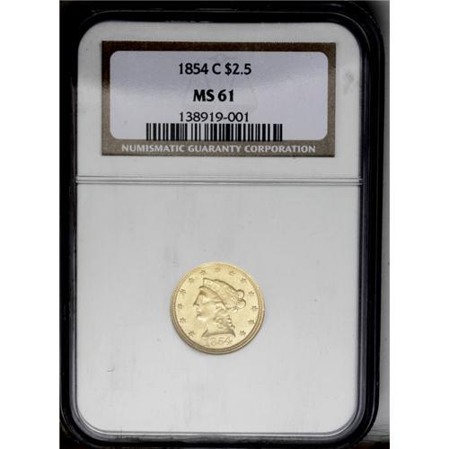<B>1854-C<$2 1/2> MS61 NGC.</B></I> Variety 15-I, the only known dies. Light yellow-gold with frosty luster. The fields have considerable reflectivity. Although the central obverse and reverse are quite weak, as always for this issue, the peripheral obverse and reverse details are boldly defined. This is an attractive example with only the usual tiny abrasions, consistent with the grade. Although a few finer examples exist, this date is an important rarity in all grades, and it is especially rare in Mint State.