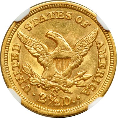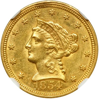 1854-C $2.50 Liberty. NGC graded MS-60. A great rarity in high grades, especially so in Mint State as seen here. Charlotte struck just 7,295 of these, virtually all of which circulated into much lower grades than seen here. We note the surfaces are a bright reddish gold color, and we see none of the haze or toning over the luster. As to the strike, this one really shines, noted expert Doug Winter wrote in his reference on the series that "Weak strikes are the rule for this date. The obverse is often blurry on the hair around Liberty's ear. The reverse is always weaker than the obverse; the center and eagle's claws are invariably very weak…." We note that the hair around Liberty's ear is fairly well struck, especially so given the date, although the reverse shows the expected softness on the eagle's thigh, claws and areas around the shield. In addition, we note a small die crack from the rim to the fraction bar on the reverse. An American classic. Rare and seldom offered in Mint State grades. Population figures are as follows: Pop 5; 5 in 61; 7 in 62; 1 in 63. In a new NGC 4 pronged holder (PCGS # 7770).