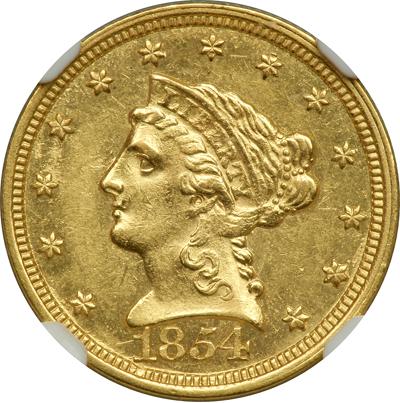 1854-C $2.50 Liberty. NGC graded MS-62. A nice untoned example. 7,295 struck. Pure and simple, this is a classic quarter eagle rarity in high grades, especially so in choice Mint State as seen here. Charlotte struck very few of these, virtually all of which made it into circulation and therefore the few survivors are in much lower grades. We note the lustrous, desirable, and definitely un-circulated surfaces of this specimen bedazzle the eye with their vibrant golden glow. Then, too, we see none of the usual haze or dullness over the luster. As to the strike, this specimen really excels. Noted expert Doug Winter wrote in his reference on the series that "Weak strikes are the rule for this date. The obverse is often blurry on the hair around Liberty's ear. The reverse is always weaker than the obverse; the center and eagle's claws are invariably very weak…." We are pleased to say that the hair around Liberty's ear is decidedly sharper than most, especially so given the date, although the reverse shows the expected softness on the eagle's thigh, claws and areas around the shield. Pop 7; 1 finer in 63. In a new NGC 4 pronged holder (PCGS # 7770).