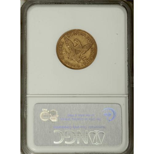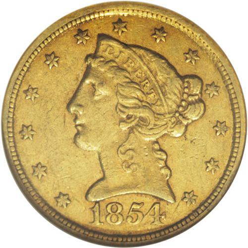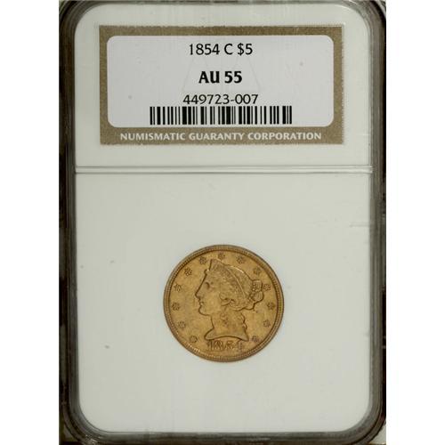 <B>1854-C $5 AU55 NGC.</B></I> Variety 22-I. The weak mintmark is a tipoff that this is a 22-I coin. The surfaces on this piece are unusually clean for this normally heavily abraded issue. They also show rich, even reddish-golden patina. Softly struck, as always. Seldom located in AU condition, it is unusual to have two high grade AU examples in the same auction.<BR><BR><b>Shipping:</b> Coins & Currency (<a target="_blank" href="http://www.heritageauctions.com/common/shipping.php">view shipping information</a>)