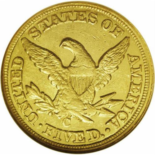 <B>1854-C<$5> AU58 NGC.</B></I> Variety 22-J. Ample semi-prooflike luster outlines design elements, and even an extended inspection beneath a glass fails to locate any consequential marks. The mintmark is sharp, unlike many '54-C fives, although the strike is soft on the eagle's neck and lower body and on the curls near the forehead. Census: 17 in 58, 7 finer (4/06).