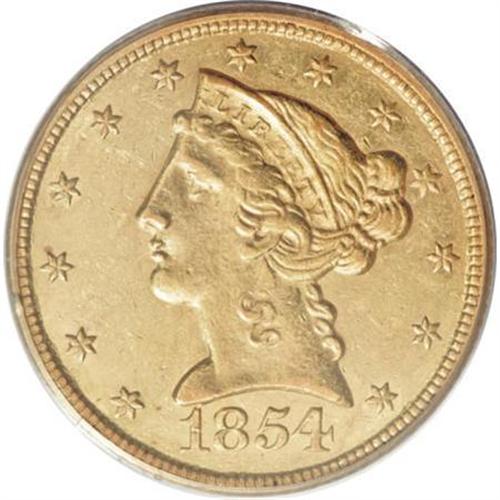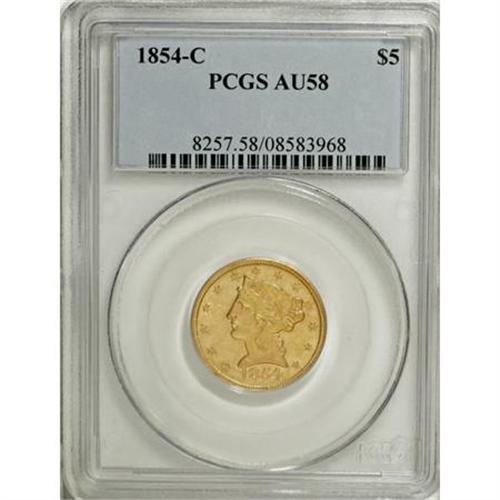 <B>1854-C $5 AU58 PCGS.</B></I> Variety 22-I. This is a much scarcer date than expected, with a relatively higher mintage of 39,200 pieces. Although the Charlotte mintmark is faint, it is fully outlined. The mintmark was evenly but lightly impressed into the die, and all C-mint half eagles struck from this reverse die have this feature. The present piece has a reasonable strike considering the mint of origin. The fields are impressively void of marks, although a few shallow mint-made strike-throughs are present. Population: 7 in 58, 7 finer (11/07).<BR><I>From The Waxhaw Collection.</B></I><BR><BR><B>Coin Engraver:</B> Christian Gobrecht<BR><BR><b>Shipping:</b> Coins & Currency (<a target="_blank" href="http://www.heritageauctions.com/common/shipping.php">view shipping information</a>)
