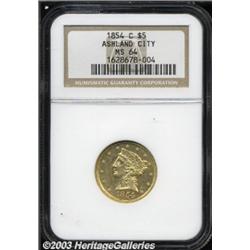 1854-C $5 MS64 NGC. Ex: Ashland City. Variety 22-I. The 1854-C is one of the scarcer Charlotte half eagles. It is rated seventh in overall rarity in the series, but a surprising number of high grade examples are known today considering the coin's overall scarcity. This appears to easily be the finest known example. The finest known listed on Winter's most recent Condition Census is a PCGS MS62. Four or five other Mint State coins are believed extant with 19-20 AU pieces known. This particular coin is weakly struck in the centers, as always. However, it is atypical in that it has bright, sparkling mint luster over each side and very few abrasions--quite unlike the heavily marked coins usually encountered. Many examples of this variety also show a weakly defined mintmark. But again, this coin is atypical in that the C is strongly brought up on the lower reverse. Important notice: Heritage usually auctions material at the rate of 200-250 lots per hour. On some occasions eBay Live bid software or the Internet may not be able to keep up with the pace of the auction. We recommend placing a realistic absentee bid now as insurance to avoid disappointment. Occasionally the auctioneer may eliminate or reject an eBay Live bid, and the auctioneer may also reopen a lot after the close of the eBay live bidding (usually because we missed an audience bid), and may reject your bid even if it shows you as the winning bidder. By bidding via eBay Live, you agree that Heritage may award the lot to another bidder at its sole discretion under the circumstances described above or any other reasonable circumstances. Also please note that all Heritage lots purchased through eBay Live carry a 20% Buyer's Premium. Please make sure you read the Terms and Conditions before you bid.