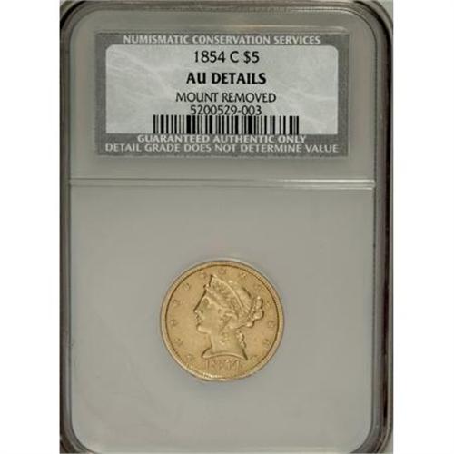 <B>1854-C $5 --Mount Removed--NCS. AU Details.</B></I> Variety 22-I, sometimes referred to as the "Weak C" variety, although the mintmark is apparent to the unaided eye. This Charlotte half eagle has been polished, and solder and edge damage are present on portions of the lower obverse and upper reverse rims.<BR><BR><B>Coin Engraver:</B> Christian Gobrecht<BR><BR><b>Shipping:</b> Coins & Currency (<a target="_blank" href="http://www.heritageauctions.com/common/shipping.php">view shipping information</a>)