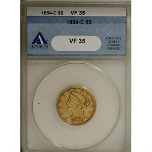 <B>1854-C $5 Weak C VF35 ANACS.</B></I> Variety 22-I. The mintmark on this Choice VF example is quite weak, as always for the variety, but it can be discerned with relative ease under low magnification. This is a nice piece for the grade that displays minor rim crumbling and a noticeable abrasion on and just below 85 in the date on the obverse. The reverse is evenly worn, smooth, and free of significant marks. <I><BR>Ex: The Marvin P. Matlock, M.D. Collection (Bowers and Merena, 3/91), lot 1756.</B></I><BR><I>From The John Stimson, Sr. Collection, Part Two.</B></I><BR><BR><B>Coin Engraver:</B> Christian Gobrecht<BR><BR><b>Shipping:</b> Coins & Currency (<a target="_blank" href="http://www.heritageauctions.com/common/shipping.php">view shipping information</a>)