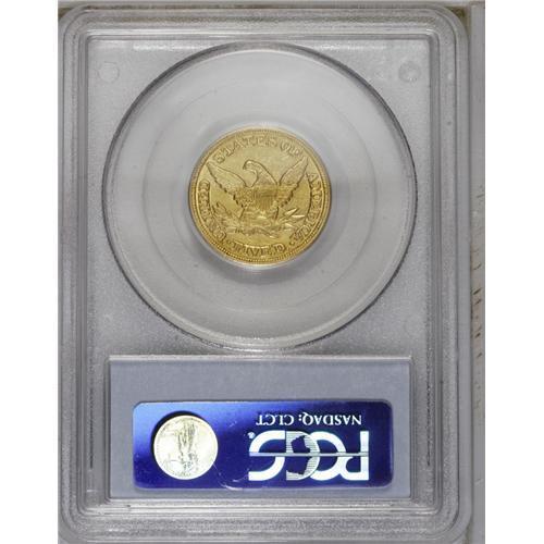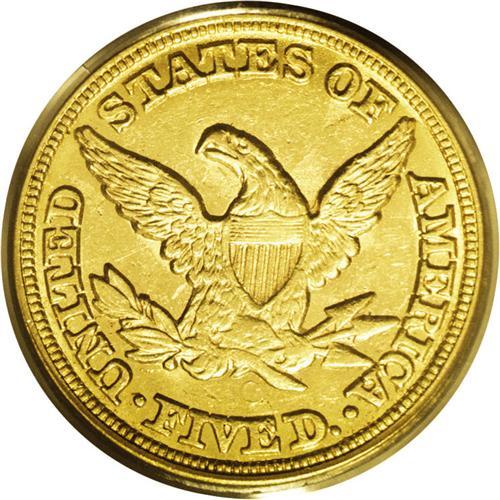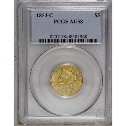 <B>1854-C<$5> Weak C AU58 PCGS.</B></I> Variety 22-I. Although the Charlotte mintmark is faint, it is fully outlined. The mintmark was evenly but lightly impressed into the die, and all C-mint half eagles struck from this reverse die have this feature. The present piece has a reasonable strike considering the mint of origin. The fields are impressively void of marks, although a few shallow mint-made strike-throughs are present.