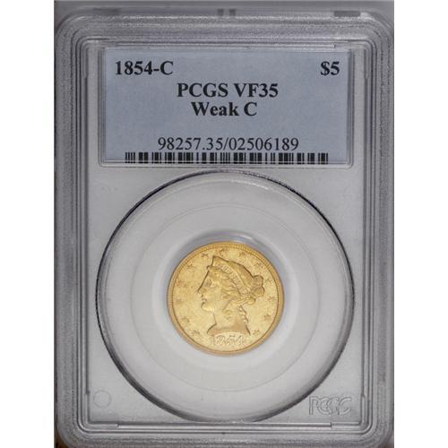 <B>1854-C $5 Weak C VF35 PCGS.</B></I> Variety 22-I. The top half of the mintmark is lightly impressed but apparent, while the lower half is extremely faint, although it can be discerned beneath a loupe. A bright and moderately abraded piece that retains an occasional hint of remaining luster. The strike is suitable for a Charlotte Mint product.<BR><I>From The Carolina Gold Collection, Part Two.</B></I>