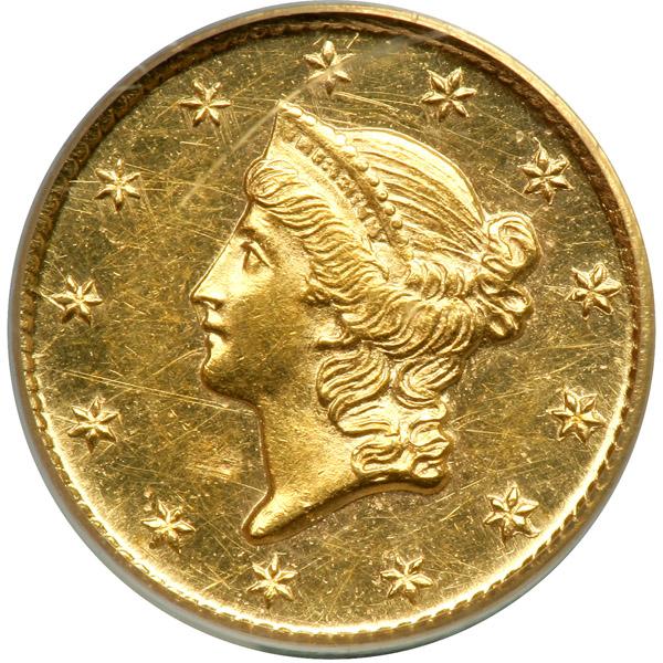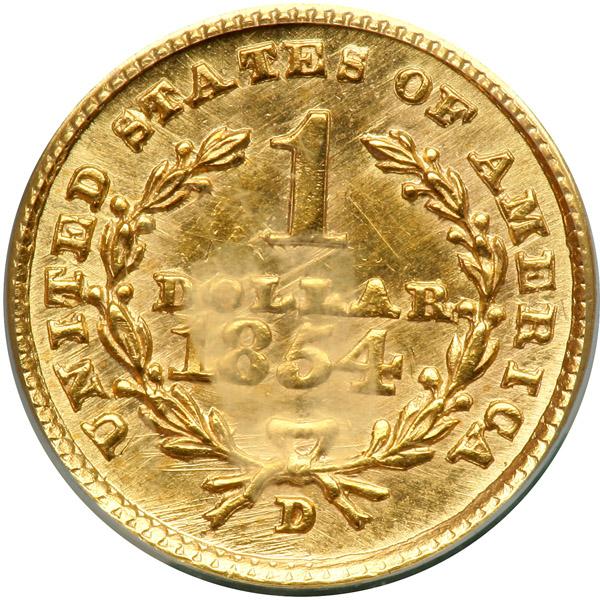1854-D $1 Gold Liberty. Improperly Cleaned. Prooflike with some light hairlines. Well struck with gold toning. Only 2,935 pieces struck. The low mintage makes this Dahlonega, Georgia date famous. This beautiful rarity sums up nicely the experience of the gold consignment of which it is a part. The coin exhibits toned satin luster on a well presented and attractive planchet with only a trace of cleaning signs in the fields and on the topmost areas of Liberty's hair. It is the kind of coin that collectors expect to find in the grade: sharply impressed, rims free of injury, and good-looks. Elusive as a date, elusive in no uncertain terms. Even more is this true in high grades. We return to the strike.