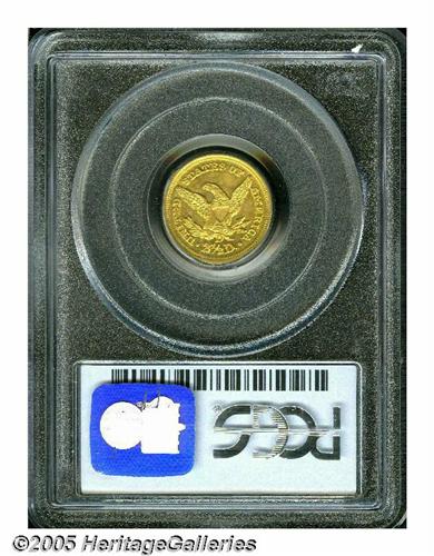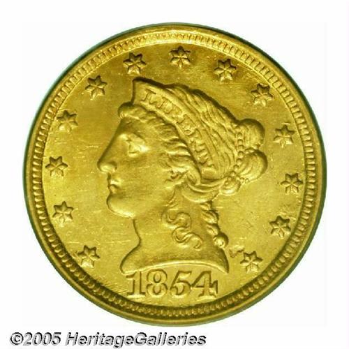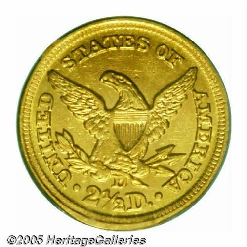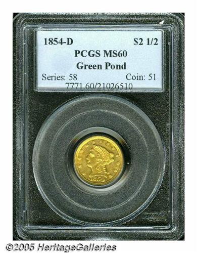 <B>1854-D<$2 1/2> MS60 PCGS.</B></I> Ex: Green Pond Collection. Variety 17-M. As one might expect from an issue with an original mintage figure of just 1,760 pieces, the 1854-D is very rare in any grade, and is among the rarest D-mint issues in the series. The quality of strike on this coin is above average for an 1854-D. The obverse has very nice detail with strong hair curls, full radial lines in the stars and well-formed denticles. The reverse, as usual, is not as sharp. There is some weakness on the eagle's left (facing) leg and both claws. The denticles are sharp in certain areas and are weak from 11 to 2 o'clock and from 6 to 8 o'clock. There are some light scuffiness in the fields and what appear to be marks near star 12 is, in fact, a diagnostic raised patch of die rust. A small mint-made planchet chip in the lower right obverse field is barely noticeable. On the reverse, there is a tiny planchet flake behind the eagle's head. This issue is often seen with very heavily abraded surfaces and the present example is far cleaner than usual. Both sides show a considerable amount of luster. The obverse becomes slightly reflective as it is tilted towards a light source while the reverse is more frosty. There are some very slight breaks in the luster as one would expect from the assigned grade but this piece has far more flash than all but a handful of survivors. Both sides have a light green-gold and orange hue. The high level of eye appeal is made more significant by the fact that this is a rare, desirable issue that is seldom found with a nice appearance.<BR><I>Ex: Green Pond Collection (Heritage, 01/04), lot 1032.</B></I>