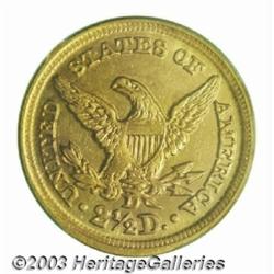 1854-D $2 1/2 MS60 PCGS. Variety 17-M. (per Doug Winter's second edition and revised attribution system). The only die pair used this year. Reverse of 1850-1859.RARITY INFORMATION: As one might expect from an issue with an original mintage figure of just 1,760 pieces, the 1854-D is very rare in any grade. It is tied for the third rarest issue in the series in terms of overall rarity and it is the sixth rarest of twenty issues in high grades. There are an estimated 75-85 pieces known with around a dozen in AU and five to six in Uncirculated. The finest is the PCGS MS62 in the Duke's Creek Collection. PCGS has graded three other coins in Uncirculated (an MS61 and two MS60s), while NGC shows two MS61s.STRIKE: The quality of strike on this coin is above average for the issue. The obverse has very nice detail with strong hair curls, full radial lines in the stars and well-formed denticles. The reverse, as usual, is not as sharp. There is some weakness on the eagle's left (facing) leg and both claws. The denticles are sharp in certain areas and are weak from 11 to 2 o'clock and from 6 to 8 o'clock.SURFACES: There are some very light hairlines (not from cleaning) on the obverse and the reverse. What appear to be marks near star 12 is, in fact, a diagnostic raised patch of die rust. A small mint-made planchet chip in the lower right obverse field is barely noticeable. On the reverse, there is a tiny planchet flake behind the eagle's head. This issue is often seen with very heavily abraded surfaces and the present example is far cleaner than usual.LUSTER: Both sides show a considerable amount of luster. The obverse becomes slightly reflective as it is tilted towards a light source while the reverse is more frosty. There are some very slight breaks in the luster as one would expect from the assigned grade but this piece has far more flash than all but a handful of survivors.COLORATION: Both sides have a light green-gold and orange hue. There is a slight amount of haze that appears to be easily removable. Most 1854-D quarter eagles have been harshly cleaned at some time.EYE APPEAL: Many small-sized gold coins graded MS60 are not attractive, but this piece is a definite exception to the rule. It has very clean surfaces, nice color and luster, and decent color that should improve when the light haze mentioned above is removed. This high level of eye appeal is made more significant by the fact that this is a rare, desirable issue that is seldom found with a nice appearance.COMPARABLES: The finest known 1854-D quarter eagle, graded MS62 by PCGS, sold for $63,250 in our February 1999 auction. In our January 1999 FUN Sale, a PCGS MS61 realized $34,500. In David Akers' Pittman Collection Sale, held in May 1998, an NGC MS61 brought $28,600. And another NGC MS61 was sold for $23,500 in our May 2000 auction.PEDIGREE: Obtained from Doug Winter and Lee Minshull in July 1999; earlier in a North Carolina collection and obtained privately from Stack's in the early 1990s. Important notice: Heritage usually auctions material at the rate of 200-250 lots per hour. On some occasions eBay Live bid software or the Internet may not be able to keep up with the pace of the auction. We recommend placing a realistic absentee bid now as insurance to avoid disappointment. Occasionally the auctioneer may eliminate or reject an eBay Live bid, and the auctioneer may also reopen a lot after the close of the eBay live bidding (usually because we missed an audience bid), and may reject your bid even if it shows you as the winning bidder. By bidding via eBay Live, you agree that Heritage may award the lot to another bidder at its sole discretion under the circumstances described above or any other reasonable circumstances. Also please note that all Heritage lots purchased through eBay Live carry a 20% Buyer's Premium. Please make sure you read the Terms and Conditions before you bid.