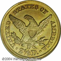 <table><tbody><tr><td><table> <TR><TD width="100%"><TABLE cellSpacing=1 cellPadding=3 width="100%" border=0><TBODY><TR><TD width="100%" bgColor=#79735c><FONT face=arial color=#ffffff size=3><B>Description</B> </FONT></TD></TR><TR><TD width="100%" bgColor=#ffffff><FONT face=arial size=2><B>1854-D $2 1/2 MS60 PCGS.</B></I> Ex: Chestatee Collection. Variety 17-M. (per Doug Winter's second edition and revised attribution system). Very rare in all grades with an original mintage of only 1,760 pieces. It is believed that only 65-75 pieces are extant today in all grades with a mere 5-6 pieces in Uncirculated. This piece is very well manufactured for an issue that is nearly always found on a poor quality planchet. The surfaces are free of mint-made defects and both sides are overlaid with pleasing, lightly mottled golden pastel colors. A suggestion of reflectiveness can be seen on the obverse. There is no wear or friction noted on the high spots and if the reverse showed a bit more "flash," this piece could have graded a point or two higher. A very desirable coin, regardless of what the "plastic" says it grades, due to its originality and eye appeal. <BR>We are aware of four Mint State 1854-D quarter eagles. These are as follows: <BR>1. Duke's Creek Collection, Ex: Heritage 2/99: 6177; Miller Collection. Graded MS 62 by PCGS. <BR>2. Georgia collection, Ex: Heritage 1999 FUN: 7655, North Georgia Collection. Graded MS 61 by PCGS.<BR>3. This coin, Ex: Chestatee Collection. Graded MS 60 by PCGS. <BR>4. Private collection Ex: David Akers' John Jay Pittman Sale, Part Two (May, 1998): 1781, Abe Kosoff's Melish Sale (April, 1956): 1218. Graded MS 61 by NGC. </FONT></TD></TR></TBODY></TABLE></TD></TR></TBODY></TABLE><BR><A name=PricesRealized></A><TABLE cellSpacing=0 cellPadding=0 width="100%" bgColor=#000000 border=0><TBODY><TR><TD width="100%"><TABLE cellSpacing=1 cellPadding=3 width="100%" border=0><TBODY><TR><TD width="100%" bgColor=#79735c><A name=PR><FONT face=arial color=#ffffff size=3><B>Previous Prices from Heritage Auctions</B> </FONT></A></TD></TR><TR><TD bgColor=#f6f6ed><TABLE cellSpacing=0 cellPadding=0 width="100%" border=1><TBODY><TR><TD align=middle width="33%"><B>Date</B></TD><TD align=middle width="33%"><B>Service</B></TD><TD align=middle width="33%"><B>Price</B></TD></TR><TR bgColor=whitesmoke><TD width="33%"><B>08/13/1999</B></TD><TD width="33%">PCGS</TD><TD width="33%">$25,300.00</TD></TR></TBODY></TABLE></TD></TR><TR><TD bgColor=#ffffff><FONT face=arial size=1 ?>PLEASE NOTE: All prices realized reflect the final hammer price PLUS the buyer's premium in auctions that charge a buyer's premium. Each item has a notation at the top of the listing indicating whether that lot included a buyer's premium. Example: A item that sells with a final hammer price of $100 and a 20% buyer's premium will display with a price realized of $120. All information listed is intended to be as accurate as possible, but errors are possible. Please use this guide carefully and inform us of any inaccuracies. </FONT></TD></TR></TBODY></TABLE></TD></TR></TBODY></TABLE><BR><TABLE cellSpacing=0 cellPadding=0 width="100%" bgColor=#000000 border=0><TBODY><TR><TD width="100%"><TABLE cellSpacing=1 cellPadding=3 width="100%" border=0><TBODY><TR><TD width="100%" bgColor=#79735c colSpan=6><FONT face=arial color=#ffffff size=3><B>Price Guide*</B> </FONT></TD></TR><TR bgColor=#f6f6ed><TD align=middle><B>Grade</B> </TD><TD align=middle><B>Coin World<BR>(Trends)</B> </TD><TD align=middle><B>Numismedia<BR>Retail</B> </TD><TD align=middle><B>Numismedia<BR>Wholesale</B> </TD><TD align=middle><B>Coin<BR>Universe</B> </TD><TD align=middle><B>Heritage<BR>Value Index</B> </TD></TR><TR bgColor=#ffffff><TD align=middle>58</TD><TD align=right>$25,000.00</TD><TD align=right>---</TD><TD align=right>$12,000.00</TD><TD align=right>---</TD><TD align=right>$15,050.00</TD></TR><TR style="FONT-WEIGHT: bold" bgColor=#cccfdd><TD align=middle>60</TD><TD align=right>$40,000.00</TD><TD align=right>---</TD><TD align=right>$22,500.00</TD><TD align=right>---</TD><TD align=right>$24,125.00</TD></TR><TR bgColor=#ffffff><TD align=middle>61</TD><TD align=right>---</TD><TD align=right>---</TD><TD align=right>$23,000.00</TD><TD align=right>---</TD><TD align=right>$31,287.50</TD></TR><TR bgColor=#ffffff><TD colSpan=6><FONT size=1>*All information listed is intended to be as accurate as possible, but errors are possible. No item may be returned or refused based on this information which is provided as a service to our customers. You should contact each pricing source directly to determine the accuracy of this information. </FONT></TD></TR></TBODY></TABLE></TD></TR></TBODY></TABLE><BR><TABLE cellSpacing=0 cellPadding=0 width="100%" bgColor=#000000 border=0><TBODY><TR><TD width="100%"><TABLE cellSpacing=1 cellPadding=3 width="100%" border=0><TBODY><TR><TD width="100%" bgColor=#79735c><FONT face=arial color=#ffffff size=3><B>Population Guide</B> </FONT></TD></TR><TR bgColor=#ffffff><TD align=middle><!-- Begin Output of Population Grid--><TABLE cellSpacing=0 cellPadding=0 width="100%" border=0><TBODY><TR><TD vAlign=center><TABLE cellSpacing=0 width="100%" border=1 cellsadding="3"><TBODY><TR><TD vAlign=center><TABLE cellSpacing=0 cellPadding=3 width="100%" border=1><TBODY><TR><TD vAlign=center align=middle bgColor=#f0f1e8 colSpan=2 <CENTER><FONT face=Arial size=2><B>PCGS Pop </B></FONT><CENTER></CENTER></TD><TD vAlign=center align=middle bgColor=#f0f1e8 colSpan=2><CENTER><FONT face=Arial size=2><B>NGC Pop</B></CENTER></FONT></TD></TR><TR><TD vAlign=center><FONT face=Arial size=2>(60)</FONT> </TD><TD vAlign=center align=right><FONT face=Arial size=2>1</FONT> </TD><TD vAlign=center><FONT face=Arial size=2>(60)</FONT> </TD><TD vAlign=center align=right><FONT face=Arial size=2>0</FONT> </TD></TR><TR><TD vAlign=center><FONT face=Arial size=2>(>60)</FONT> </TD><TD vAlign=center align=right><FONT face=Arial size=2>2</FONT> </TD><TD vAlign=center><FONT face=Arial size=2>(