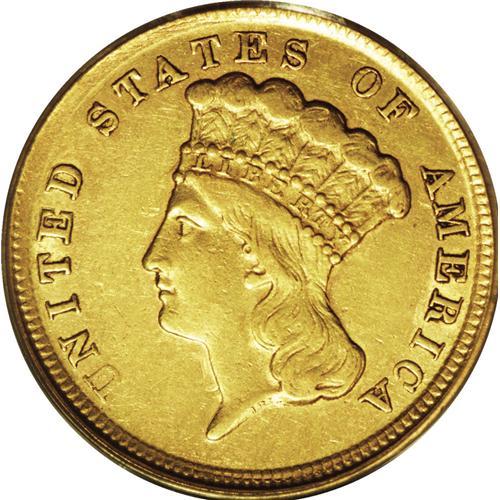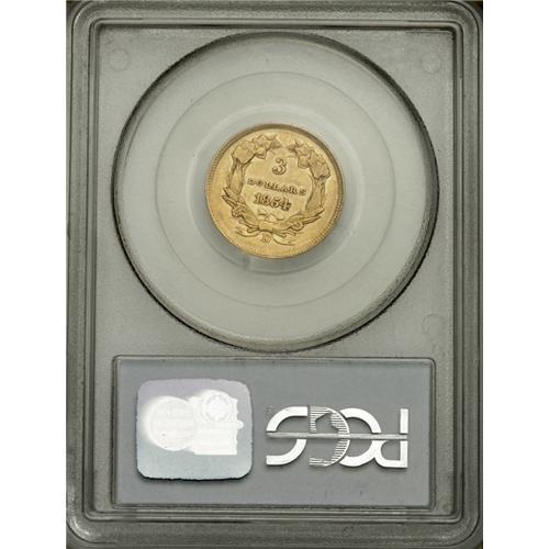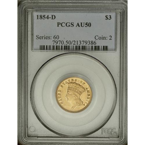 <B>1854-D $3 AU50 PCGS.</B></I> Variety 1-A. Only 1,120 pieces were struck of this near-legendary coin. This is the only three dollar gold issue produced at the historic Dahlonega Mint. As always, the striking details are soft with especially weak definition on the U in UNITED and doubling on TED (both of which are diagnostic). The surfaces are remarkably free from handling marks, scratches, or any other type of post-striking impairments, except for a pair of small puncture marks very close to the 4 in the date. Minor die clash marks are noted in the reverse fields, and beneath Liberty's chin. Light green-gold color overall, with attractive peach accents. Faint remnants of mint luster can still be discerned in the more protected areas of the design.<BR><BR><b>Shipping:</b> Coin/Currency (<a target="_blank" href="http://www.heritageauctions.com/common/shipping.php">view shipping information</a>)