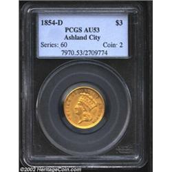 1854-D $3 AU53 PCGS. Winter 1-A. The 1854-D is the only Dahlonega issue in the challenging Three Dollar Gold series, which when combined with the issue's absolute rarity makes it one of the most prized issues among all branch mint gold coins. Only 1,120 pieces were struck, and today probably fewer than 100 pieces are extant in all grades, most of which are either damaged to some degree or in the VF-XF grade ranges. This piece has modest wear on the highpoints and is typically softly struck, with delicate orange peripheral accents over subdued olive-gold surfaces. The nearly diagnostic die clash mark located in front of Liberty's neck is visible, but very light. From the Ashland City Collection. Important notice: We expect to be auctioning lots at the rate of 200-250 per hour. Sometimes eBay Premier live bid software cannot keep up with that pace, so we strongly recommend that you place a realistic proxy bid now as insurance to avoid disappointment. Also please note that all Heritage/CAA lots purchased through eBay Premier carry a 20% Buyer's Premium. Please make sure you read the Terms and Conditions.