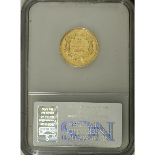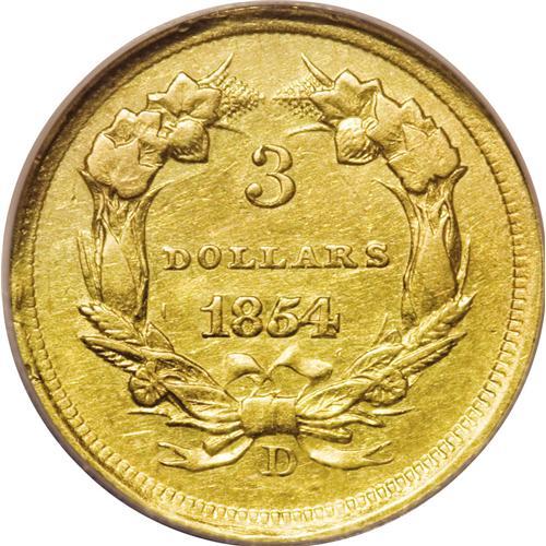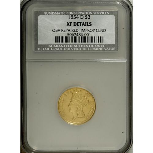 <B>1854-D $3 --Obverse Repaired, Improperly Cleaned--NCS. XF Details.</B></I> Variety 1-A. Just one die pair was used to strike 1,120 three dollar gold pieces in Dahlonega during the year, and this is the only mintage of the denomination at that facility. This is a light yellow-gold example with good eye appeal despite extensive smoothing of the obverse fields and hairlines. Representatives of this issue are in demand in all grades and are rarely seen. When encountered, most coins are VF at best. All 1854-D threes have irregularity on the rims, especially on the obverse. This is true on this piece as well, and the reverse has a high wire rim.<BR><BR><b>Shipping:</b> Coins & Currency (<a target="_blank" href="http://www.heritageauctions.com/common/shipping.php">view shipping information</a>)