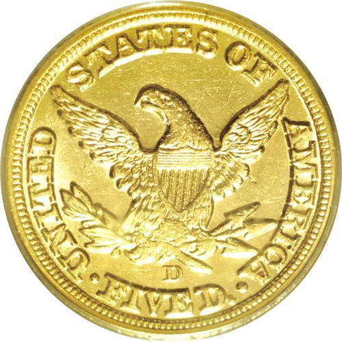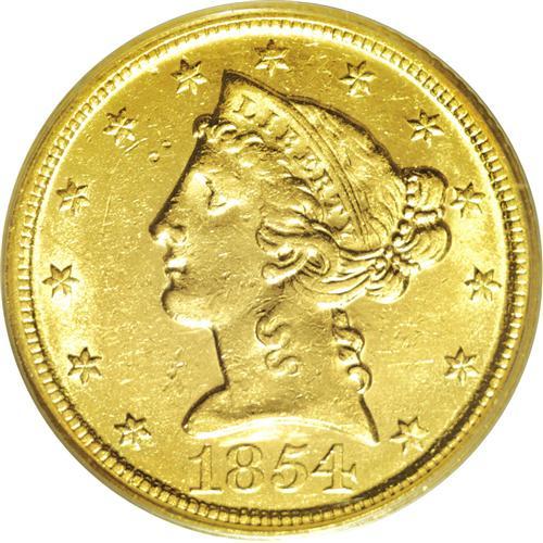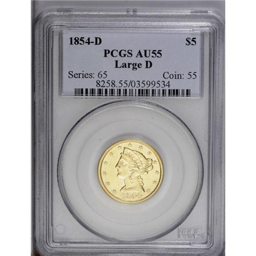<B>1854-D<$5> Medium D AU55 PCGS.</B></I> The reflective luster of this piece is scarcely dimmed by light highpoint wear. As usual for this issue, some striking weakness appears on the eagle, especially on its neck. Only a few marks appear in the fields. Incorrectly designated as a Large D by PCGS. Population: 20 in 55, 45 finer (7/06).<BR><I>From The Wyoming Collection.</B></I>