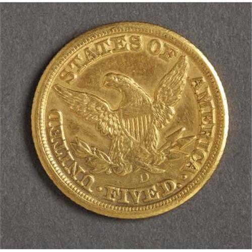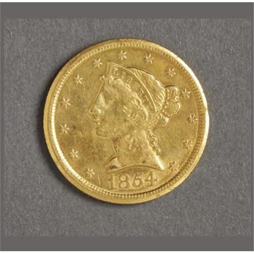 <B>1854-D $5 GOLD HALF EAGLE FROM THE DAHLONEGA, GEORGIA MINT.</B></I> The city of Dahlonega, Georgia, in Lumpkin County, was the epicenter of the first U.S. gold rush starting in the late 1820s. Miners poured into the area by the thousands looking to get rich quick. There soon arose a need for a method to convert the gold dust and nuggets into a more spendable medium. Southern congressmen used their political influence to get an act passed in 1835 creating three new mints, all in southern states. One of these was is Dahlonega and it opened for business on February 12, 1838 for the receipt and assay of gold bullion. The first eighty half eagles bearing the early "D" mintmark were minted on April 21, 1838. Before it was captured by the Confederacy in 1861, this mint produced $6.1 million in U.S. gold coinage. <BR><BR>A five-dollar coin was quite valuable for the time and region so many were used for overseas trade. The remaining quantities would have stayed primarily in the area they were minted- the Deep South. This very coin was very likely circulating in the Confederate States of America during the period of the Civil War. Numismatists actively pursue these Dahlonega mint coins both for their history and their beauty. A beautiful example such as this would certainly find a welcome place in any Civil War collection. Original mintage: 56,413. Grade: VF-XF cleaned.<BR><BR><b>Shipping:</b> Miscellaneous Collectibles, Smal (<a target="_blank" href="http://www.heritageauctions.com/common/shipping.php">view shipping information</a>)
