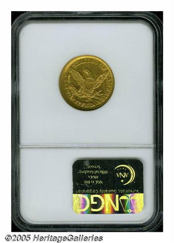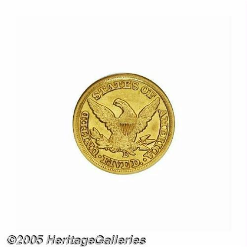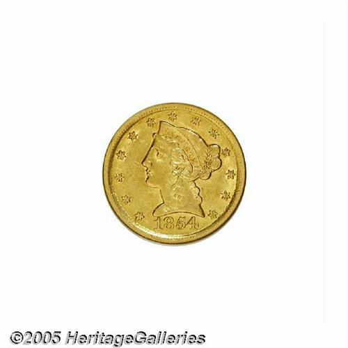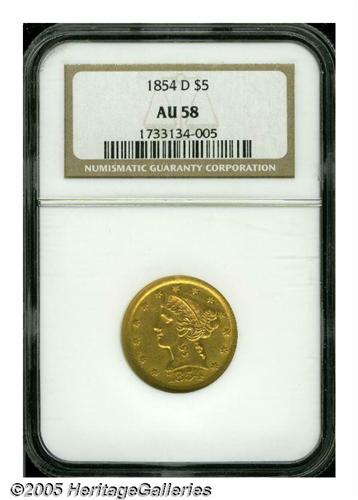 <B>1854-D<$5> Large D AU58 NGC.</B></I> While the 1854-D is one of the three or four most common Dahlonega Half Eagles, it is not often encountered in high-end AU grades or finer, and is extremely popular among type collectors as an example from this Southern mint. This example exhibits slightly subdued yellow-gold surfaces, with light traces of wear across the highest design points, and typical surface abrasions. A nice-looking Dahlonega Half Eagle that will suffice as a date or mint representative in any collection.