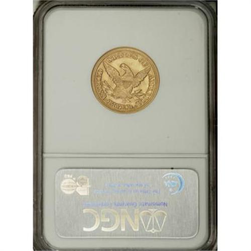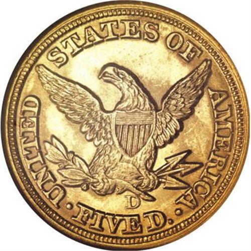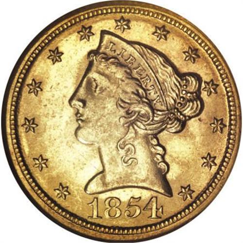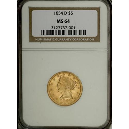 <B>1854-D $5 Large D MS64 NGC.</B></I> Variety 31-X. Branch mint gold guru Douglas Winter notes in his <I>Gold Coins of the Dahlonega Mint </B></I>that the 1854-D issue comes in two distinct and dissimilar appearances: "The majority are flatly struck at the borders and have an almost sunken appearance. This is the result of the centers being so much sharper than the border. Many have nearly complete hair detail with just a touch of weakness on the curls near the face of Liberty. The stars are mostly sharp while the denticles are blurry and indistinct. The reverse shows the same appearance with strong detail on the feathers of the eagle and the claws but weakness on the denticles. <I>Some are known which are stronger at the border and which show less pronounced beveling of the rims. These pieces are quite rare." </B></I>(Emphasis ours.)<BR> This wonderful piece is an example that shows both a good strike at the borders as well as in the centers of each side. All of the denticles are well articulated on both sides, and there is little beveling in evidence. A bit of strike softness shows on the fletchings and the hair just below ER, but overall the strike is marvelous for the issue. The surfaces are peach-gold and remarkably unabraded for a D-mint gold piece, and the luster is equally marvelous and radiant.<BR> Winter notes that the 1854-D is one of the more common D-mint half eagles, especially in higher grades, but that it is much rarer in Mint State than the frequently seen 1853-D. The highest-graded example Heritage has ever offered is an MS65. Census: 1 in 64, 2 finer (12/07).<BR><BR><B>Coin Engraver:</B> Christian Gobrecht<BR><BR><b>Shipping:</b> Coins & Currency (<a target="_blank" href="http://www.heritageauctions.com/common/shipping.php">view shipping information</a>)
