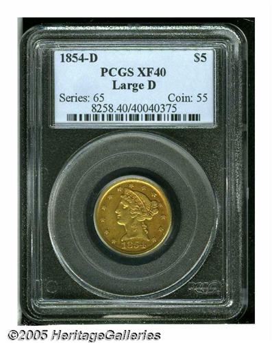 <B>1854-D<$5> Large D XF40 PCGS.</B></I> Variety 30-?. The mintmark location differs from the listed W and X varieties. An original peach-gold piece that lacks obtrusive marks. Liberty's curls are typically struck, but the wings and shield are sharp for the mint and type.