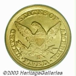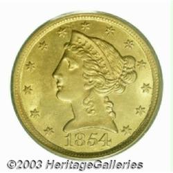 1854-D $5 MS64 PCGS. Large mintmark. Variety 30-T. (per Doug Winter's second edition and revised attribution system). The 1 in the date is close to the truncation; reverse of 1853. This is one of five varieties known.RARITY INFORMATION: The 1854-D is the second most available Dahlonega half eagle in higher grades, trailing only the 1853-D. There are an estimated 225-250 pieces known in all grades with around a dozen in Uncirculated. The finest known is unquestionably the Duke's Creek coin (Ex: Milas, Montgomery, and Scanlon Collections) that has been graded MS65 by PCGS. Many experts feel that it is one of the two finest known Dahlonega half eagles of any date. The Green Pond coin is the second finest graded by PCGS and is the only piece ever certified as MS64 by this service.STRIKE: The strike on this coin is similar to that seen on the Green Pond 1853-D half eagle. For the date, the detail is excellent with the borders lacking the beveled appearance seen on many 1854-D half eagles. The obverse is very sharp except for the curl below the ear of Liberty. The denticles are about 50% full while the stars show nearly complete radial lines. The reverse is exceptionally bold in the center. The border is a bit weak from 8:00 to 11:00. The mintmark is very sharp which is an important factor on this date as a number of higher grade coins have weak mintmarks.SURFACES: A few light hairlines (not from cleaning) can be seen on the obverse and reverse and there is a small contact mark on the throat that is so well blended into the coloration that it is difficult to see. Some light, removable haze rests on both sides but is not easily visible.LUSTER: The luster is very frosty and is more suggestive of a Dahlonega half eagle from the mid-1840s than the mid-1850s. Despite the fact that this is a somewhat available coin in higher grades, it is still extremely difficult to locate an 1854-D half eagle with acceptable luster.COLORATION: Both sides show medium orange-gold color that is attractive. The range of colors seen on this date varies from orange-gold to deep green-gold.EYE APPEAL: This is an extremely well struck coin that does not show the typical soft, "mushy" appearance that beleaguers this date. Here is another wonderful possibility for the collector seeking a solitary ultra-high grade Dahlonega half eagle for a type set.COMPARABLES: In our January 2003 auction, we sold an NGC MS65 as lot 4785 for $62,100. The finest known 1854-D half eagle, graded MS65, sold for $71,500 in Stack's May 1995 Ed Milas Collection auction.PEDIGREE: Obtained via private treaty from Heritage Rare Coin Galleries in November 1998; earlier Ex: Mark Chrans; Ron Gillio Mail Bid Sale/1998 ANA. This is the plate coin in the second edition of Doug Winter's "Gold Coins of the Dahlonega Mint 1838-1861." It is listed in the current Condition Census as the third finest known 1854-D half eagle. Important notice: Heritage usually auctions material at the rate of 200-250 lots per hour. On some occasions eBay Live bid software or the Internet may not be able to keep up with the pace of the auction. We recommend placing a realistic absentee bid now as insurance to avoid disappointment. Occasionally the auctioneer may eliminate or reject an eBay Live bid, and the auctioneer may also reopen a lot after the close of the eBay live bidding (usually because we missed an audience bid), and may reject your bid even if it shows you as the winning bidder. By bidding via eBay Live, you agree that Heritage may award the lot to another bidder at its sole discretion under the circumstances described above or any other reasonable circumstances. Also please note that all Heritage lots purchased through eBay Live carry a 20% Buyer's Premium. Please make sure you read the Terms and Conditions before you bid.
