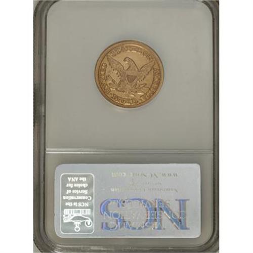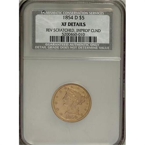 <B>1854-D $5 Medium D--Reverse Scratched, Improperly Cleaned--NCS. XF Details.</B></I> Variety 31-W. This Dahlonega Mint five dollar piece is hairlined and displays a few bright, short marks above the olive branch. The obverse has a small rim ding at 7 o'clock. The eagle is nicely struck, while Liberty's hair is softly brought up.<BR><BR><B>Coin Engraver:</B> Christian Gobrecht<BR><BR><b>Shipping:</b> Coins & Currency (<a target="_blank" href="http://www.heritageauctions.com/common/shipping.php">view shipping information</a>)