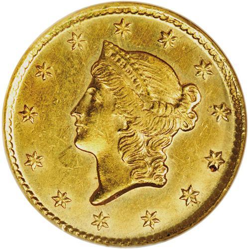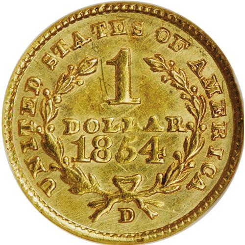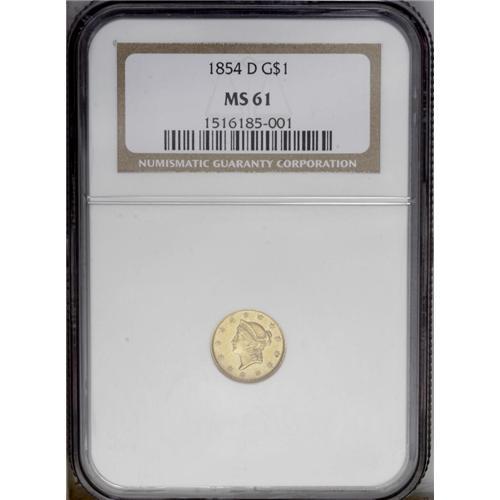 <B>1854-D<G$1> MS61 NGC.</B></I> Variety 6-H. This attractive and generally lustrous rare date gold dollar offers delicate apricot and lime toning. The strike is crisp for the mint, with only moderate incompleteness of detail in the centers. A pair of light vertical marks are noted left of the 1 in the denomination and near stars 8 and 11, but overall, the surfaces are pleasing for the MS61 grade. A mere 2,935 pieces were struck. Census: 14 in 61, 10 finer (2/06).
