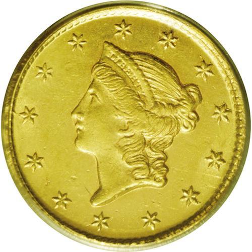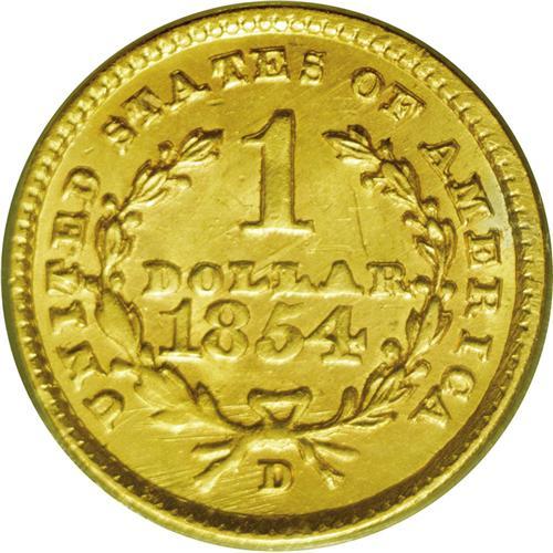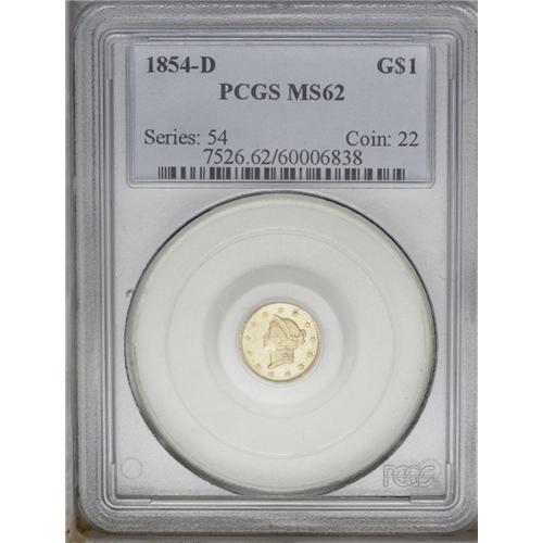 <B>1854-D<G$1> MS62 PCGS.</B></I> Variety 6-H. Any above-average strike for this challenging Type One issue, one of just 2,935 pieces issued, with only minor softness visible at the centers. However, both the date and the denomination, while a trifle mushy in places, are clearly legible. Surface marks are generally confined to the area between star 1 and Liberty's chin. Heavy die lines found at the base of the reverse are a product of striking and an assurance of authenticity. Undoubtedly one of the finest surviving representatives of this rare Dahlonega gold dollar. Population: 4 in 62, 0 finer (3/06). <BR><BR><B>Important notice:</B> Heritage usually auctions material at the rate of 200-250 lots per hour. On some occasions eBay Live bid software or the Internet may not be able to keep up with the pace of the auction. We recommend placing a realistic absentee bid now as insurance to avoid disappointment. Occasionally the auctioneer may eliminate or reject an eBay Live bid, and the auctioneer may also reopen a lot after the close of the eBay live bidding (usually because we missed an audience bid), and may reject your bid even if it shows you as the winning bidder. By bidding via eBay Live, you agree that Heritage may award the lot to another bidder at its sole discretion under the circumstances described above or any other reasonable circumstances. Since eBay bids are not shown to us until we open the lot on the floor, we treat those bids just like floor bids. In most cases the floor responds before the eBay bid is presented to us, due to Internet lag time, so for consistency we have made it a policy that floor bids are always considered first over tie eBay live bids. Also please note that all Heritage lots purchased through eBay Live carry a 20% Buyer's Premium. Please make sure you read the Terms and Conditions before you bid. This lot is being auctioned in conjunction with a live floor auction by Heritage Galleries & Auctioneers. All final auction and invoice information will be supplied by Heritage Galleries & Auctioneers, and all other information should be considered preliminary. Lot:2269 <BR><BR><B>Winning Notification and Billing:</B> After the FINAL session in this auction is complete, Heritage will send e-mail and snail mail invoices. This process normally takes several days. All final auction and invoice information will be supplied by Heritage Galleries & Auctioneers, and all other information should be considered preliminary. <BR><BR>This auction will be conducted on a live auction floor and over the Internet through eBay Live. If you choose to place an absentee bid, please take a moment to <font color='#0000ff'><u><a href='http://pages.ebay.com/liveauctions/help/before/laabsentee.html'>learn how eBay Live absentee bidding works</a></u></font><font color='#000000'>