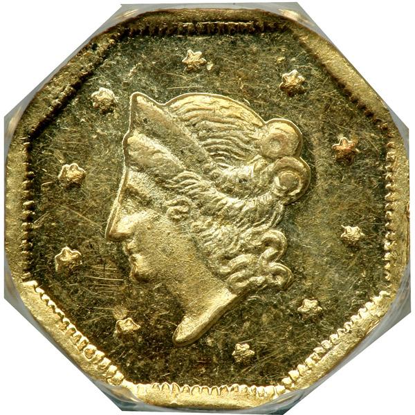 1854 Dollar Octagonal. Breen and Gillio-508. High Rarity 4. NGC graded MS-63 Prooflike. A glittering untoned example. A smaller Liberty head than the former, not as sharply impressed in the die but clearly delineating the hair waves and small coronet of Liberty. Light hairlines. Denomination and date within a circle of dots. F.D. below for Frontier & Deviercy, the issuer. Pop 3; 3 finer.