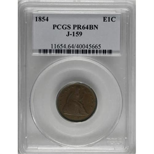 <B>1854 E1C One Cent, Judd-159, Pollock-186, Low R.7, PR64 Brown PCGS.</B></I> The obverse small cent die was created by a portrait lathe that used an 1854 silver dollar as a model. The portrait lathe caused many circular die lines, and the design is blurry. Notably, the 4 in the date resembles a 1. On the well-made reverse die, 1 CENT is encircled by an oak and acorn wreath. Struck in copper with a plain edge. Chocolate-brown with occasional olive overtones. The obverse has a mere whisper of distributed carbon, while the reverse is well preserved.<BR><BR><b>Shipping:</b> Coins & Currency (<a target="_blank" href="http://www.heritageauctions.com/common/shipping.php">view shipping information</a>)