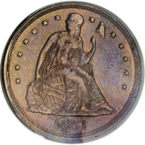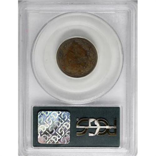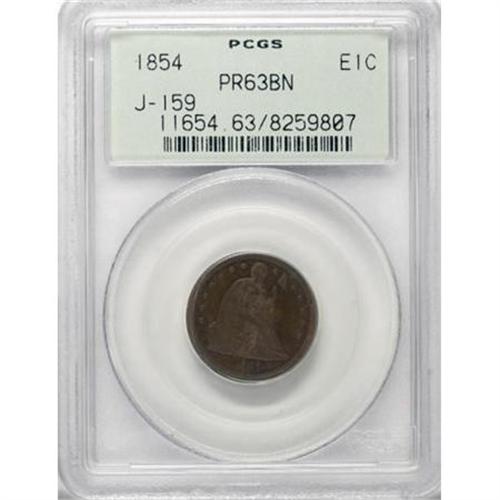 <B>1854 E1C One Cent, Judd-159, Pollock-186, High R.7, PR63 Brown PCGS.</B></I> The obverse of this small cent die was created by a portrait lathe that used an 1854 silver dollar as a model. The portrait lathe caused many circular die lines, and the design is blurry. Notably, the 4 in the date resembles a 1. On the well-made reverse die, 1 CENT is encircled by an oak and acorn wreath. Struck in copper with a plain edge. This was a widely produced pattern that included piece struck in at least three varieties of German silver, copper-nickel alloy, a 78% silver piece, die struck copper pieces as well as electrotypes. This is a die struck example in copper. Weakly struck, as always, with considerable red remaining on the obverse and deep brown and blue patina over the reverse. <BR><BR><b>Shipping:</b> Coins & Currency (<a target="_blank" href="http://www.heritageauctions.com/common/shipping.php">view shipping information</a>)