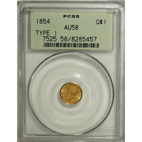 <B>1854 G$1 Type One AU58 PCGS.</B></I> PCGS Population (404/1085). NGC Census: (255/2406). Mintage: 855,502. Numismedia Wsl. Price for NGC/PCGS coin in AU58: $198. (#7525)<BR><BR><B>Coin Engraver:</B> James B. Longacre<BR><BR><b>Shipping:</b> Coins & Currency (<a target="_blank" href="http://www.heritageauctions.com/common/shipping.php">view shipping information</a>)