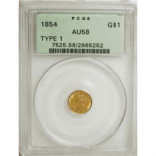 <B>1854 G$1 Type One AU58 PCGS.</B></I> PCGS Population (407/1092). NGC Census: (259/2416). Mintage: 855,502. Numismedia Wsl. Price for NGC/PCGS coin in AU58: $198. (#7525)<BR><BR><B>Coin Engraver:</B> James B. Longacre<BR><BR><b>Shipping:</b> Coins & Currency (<a target="_blank" href="http://www.heritageauctions.com/common/shipping.php">view shipping information</a>)
