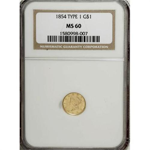 <B>1854 G$1 Type One MS60 NGC.</B></I> NGC Census: (57/2322). PCGS Population (39/1039). Mintage: 855,502. Numismedia Wsl. Price for NGC/PCGS coin in MS60: $208. (#7525)<BR><BR><B>Coin Engraver:</B> James B. Longacre<BR><BR><b>Shipping:</b> Coins & Currency (<a target="_blank" href="http://www.heritageauctions.com/common/shipping.php">view shipping information</a>)