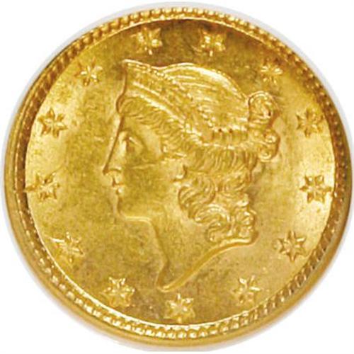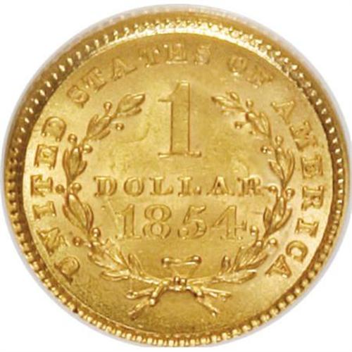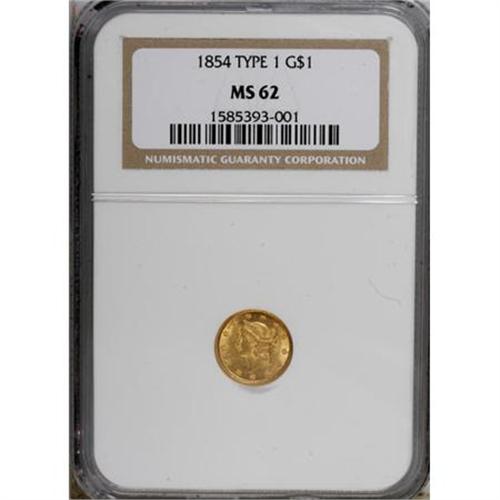 <B>1854 G$1 Type One MS62 NGC.</B></I> NGC Census: (965/735). PCGS Population (417/460). Mintage: 855,502. Numismedia Wsl. Price for NGC/PCGS coin in MS62: $300. (#7525)<BR><BR><B>Coin Engraver:</B> James B. Longacre<BR><BR><b>Shipping:</b> Coins & Currency (<a target="_blank" href="http://www.heritageauctions.com/common/shipping.php">view shipping information</a>\)