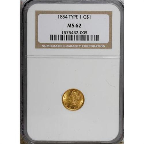 <B>1854 G$1 Type One MS62 NGC.</B></I> NGC Census: (970/738). PCGS Population (419/461). Mintage: 855,502. Numismedia Wsl. Price for NGC/PCGS coin in MS62: $325. (#7525)<BR><BR><B>Coin Engraver:</B> James B. Longacre<BR><BR><b>Shipping:</b> Coins & Currency (<a target="_blank" href="http://www.heritageauctions.com/common/shipping.php">view shipping information</a>)