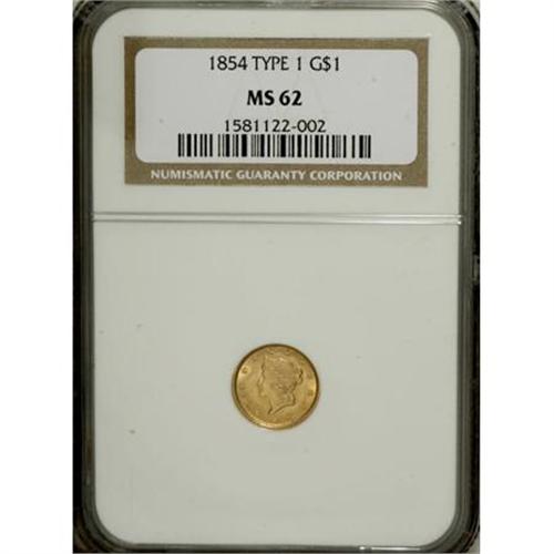 <B>1854 G$1 Type One MS62 NGC.</B></I> NGC Census: (976/744). PCGS Population (421/465). Mintage: 855,502. Numismedia Wsl. Price for NGC/PCGS coin in MS62: $340. (#7525)<BR><BR><B>Coin Engraver:</B> James B. Longacre<BR><BR><b>Shipping:</b> Coins & Currency (<a target="_blank" href="http://www.heritageauctions.com/common/shipping.php">view shipping information</a>)